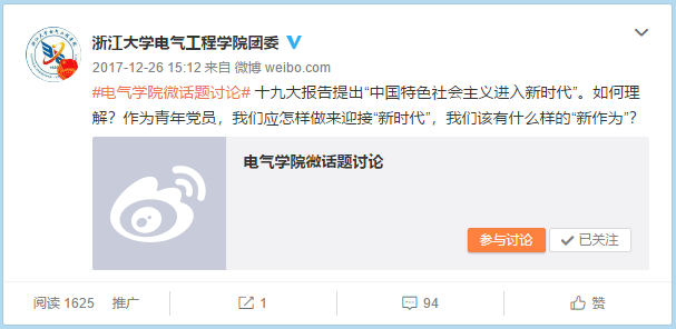 为引导学生党员深入学习、宣传、贯彻党的十九大精神,电气工程学院充分利用网络新媒平台,拓展党员教育的时空,在全院党员范围内,以十九大报告及新党章为讨论话题,如火如荼地开展“微话题”讨论。