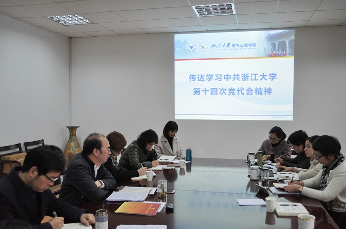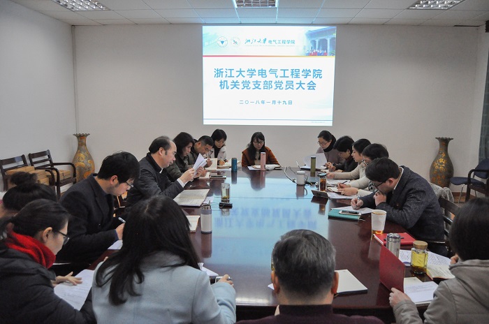 2018年1月19日,电气工程学院机关党支部在教二405会议室召开党员大会,传达学习中共浙江大学第十四次代表大会精神,开展党支部组织生活会和民主评议党员工作。学院党委书记王瑞飞、副书记张晓洁和机关全体党员、员工参加了会议。会议由机关党支部书记卢俏主持。