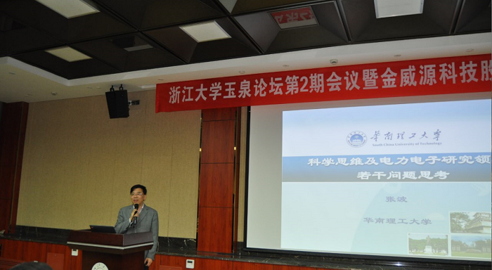 浙江大学玉泉论坛第2期会议的第一个报告是张波带来的《科学思维及对电力电子研究领域的思考》。作为一名科研工作者,张教授在报告中明确了科学家应具备的科学思维的四个特征,即“精确性、逻辑性、狭义性和想象力”。他以电力电子技术领域专业问题为例,演示了训练科学思维的四个阶段:想象、定义、分析和描述。他严谨的逻辑、创新的洞见、生动的实例,妙趣横生的语言为在场的师生打开了一扇新的科学研究的大门。