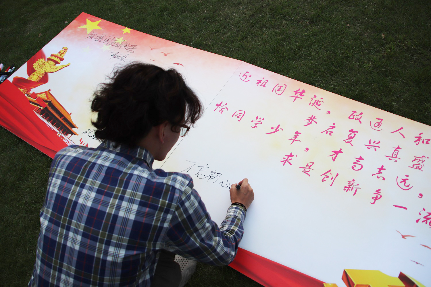 “迎祖国华诞,政通人和,梦启复兴臻盛世;恰同学少年,才高志远,求是创新争一流。”下午,2016级的电气学子们在玉泉校区开展“当代青年的中国梦”主题团日活动。细密如织的大草坪上、雄伟峻拔的毛泽东像前、文气氤氲教学楼中,时常可见电气学子们的身影在穿梭,时不时停在某一位行人身边,邀请他为我们的祖国献礼,说出心中最美好的期冀,写下他们心中最真挚的祝福。电气学子、在校学生、保安大叔、宿管大叔、食堂阿姨、稚嫩孩童、路人游客、外卖小哥……在他们真挚的祝福中共庆祖国生辰,在他们如花的笑靥中共祝祖国华诞!