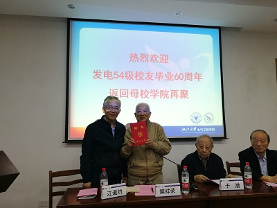2018年10月13日上午,浙江大学电气工程学院第二教学大楼121教室,一批耄耋之年的老校友们正一个个坐在教室里,认真聆听着电气学院电机系党支部书记江道灼教授介绍学校、学院、学科的发展前景,同学们心底涌起的一股股自豪感和荣誉感油然而生,为当今浙大的快速发展,为浙大师生赶超世界一流所做出的业绩感到无比的自豪。60年前青春少年,如今已耄耋之年,发电541、2班樊祥荣、张炎华同学分别介绍了这次同学会的筹备情况,以及同学们克服重重困难,延续深深同窗情的感人故事。江道灼书记代表学校为樊祥荣校友颁发了浙江大学班级联络员荣誉证书。当年的任课老师,老学长于渤教授到会祝贺。会后同学们在教二门前和毛主席像前集体合影留念。步行去学生第一食堂二楼餐厅体验学生餐。