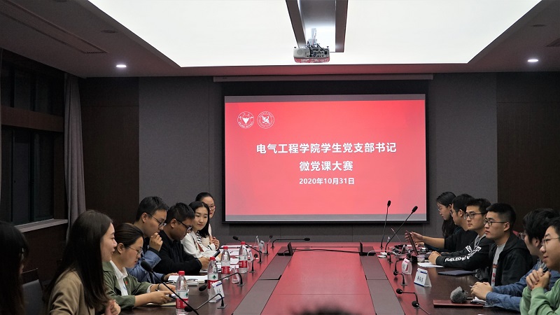 2020年10月31日晚,电气工程学院党支部书记微党课大赛在电机楼201会议室举行,浙江大学辅导员党建工作室成员沈丹、陈思源,浙江大学研究生理论宣讲团副团长陈楠、秦志鑫,电气工程学院团委副书记沈远、董萌苇应邀担任本次比赛的评委。比赛由董萌苇主持。