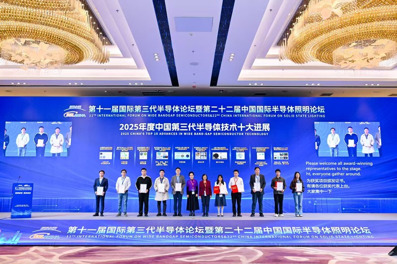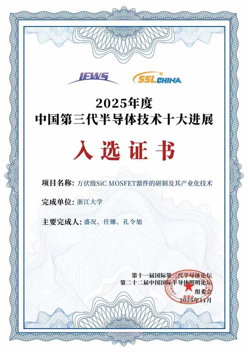 在开幕大会上公布了2025年度中国第三代半导体技术十大进展评选结果,盛况教授团队的“万伏级碳化硅MOSFET器件研制及其产业化技术”成功获得入选,成果完成人之一任娜研究员上台领奖。