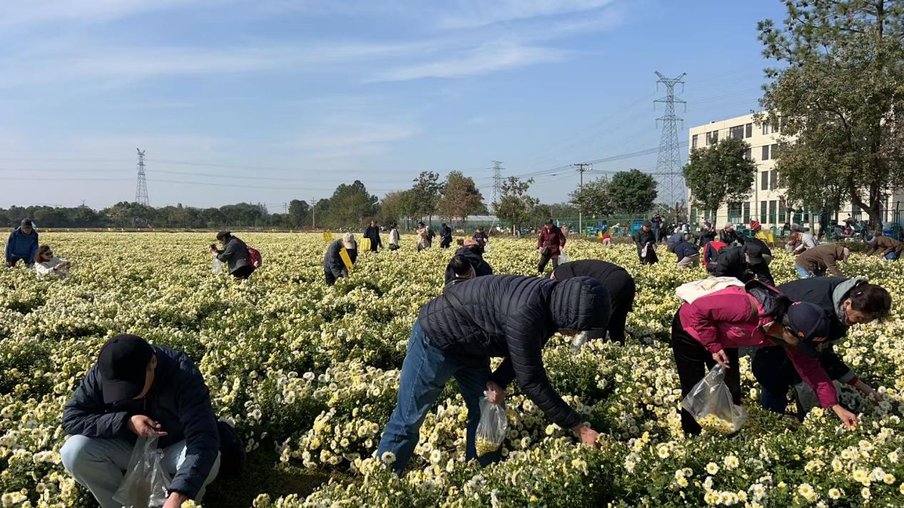 参观完丰子恺纪念馆后,老同志们来到桐乡杭白菊绿色示范种植基地。这里以麦菊轮作模式为特色,凭借土地高效利用和生态循环发展的优势,在菊花种植领域树立了典范。基地里,老同志们了解了这一生产方式的独特之处,还亲自下地采摘菊花,体验了一番“采菊东篱下,悠然见南山”的意境。