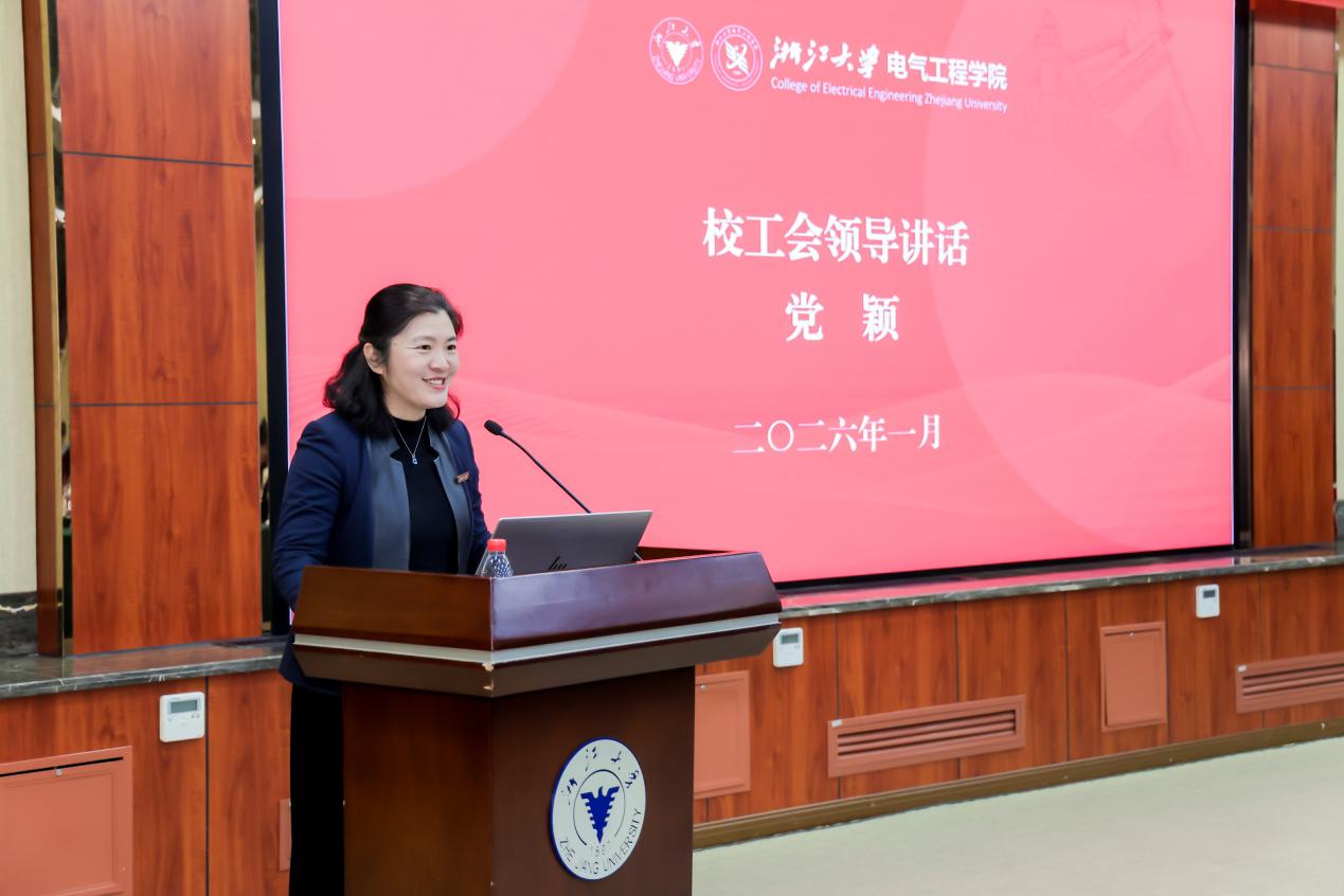 党颖代表学校工会对大会的召开表示热烈祝贺,高度肯定了电气学院在“十四五”期间取得的成绩,特别是学院工会在思想引领、教育教学、科研创新、民主管理等方面的贡献,高度评价了学院工会在持续提升教职工的获得感、幸福感、归属感发挥的作用。她对学院工会提出三点要求:一要筑魂育人强引领,以党的创新理论为指导,筑牢教职工信仰根基,服务学院“双一流”建设;二要融入中心促发展,通过弘扬先进精神、开展竞赛活动、选树宣传典型,激发教职工创造活力,助力学院高质量发展;三要贴心服务助家园,深化民主管理,关注教职工多元需求,办好实事、打造文化品牌,增强归属感。希望在学院党委领导和行政支持下,学院“双代会”团结凝聚全院力量,心怀“国之大者”,奋力走在前列,助力学院新一轮发展和学校迈向世界一流大学前列 。